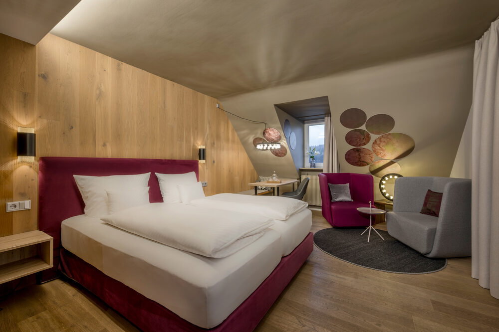 Genießen Sie Ihren Aufenthalt in einem der 43 geschmackvoll eingerichteten Zimmer - von klassisch bis modern in edlem, klarem Design.Die Gästezimmer variieren in Größe und Einrichtung. Alle Räume sind mit Dusche, WC, Haartrockner, Badetasche (mit Bademantel, Sauna- und Badetuch), hochwertigen Körperpflegeprodukten, Flat-TV mit Radio, Safe, Telefon und teilweise mit Balkon/Terrasse und Klimaanlage ausgestattet. Die Suiten verfügen zudem über eine Whirlwanne im Zimmer und eine private Sauna auf der Terrasse.