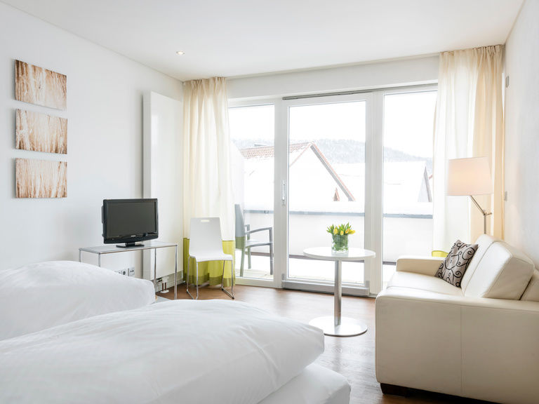 Helle, moderne Deluxe-Zimmer mit hochwertigen Eichenholzböden und schönem Balkon.