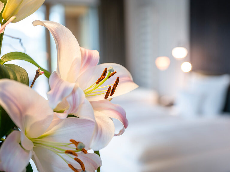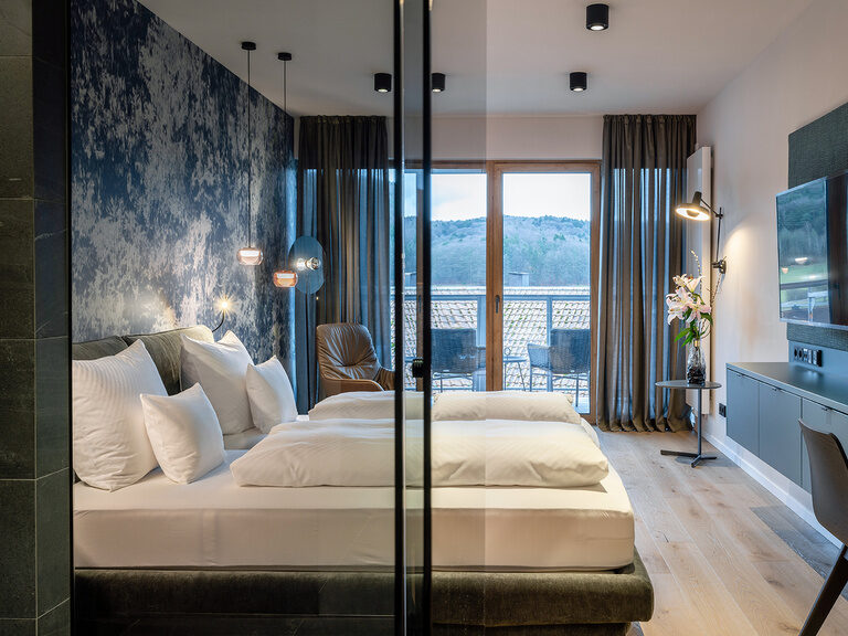 Mondänes Flair mit Designermöbeln, individuelle Wandbeläge, himmlischer Schlafkomfort im Doppelbett der Manufaktur Schramm und ein großer Balkon mit herrlichem Blick machen Ihren Aufenthalt bei uns zu einem besondern Erlebnis.