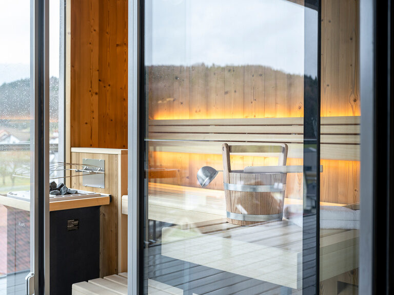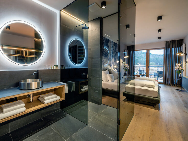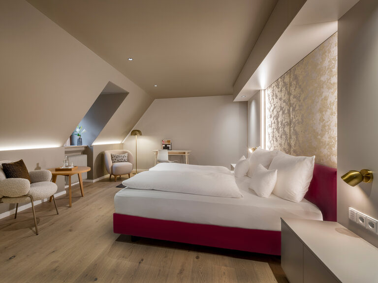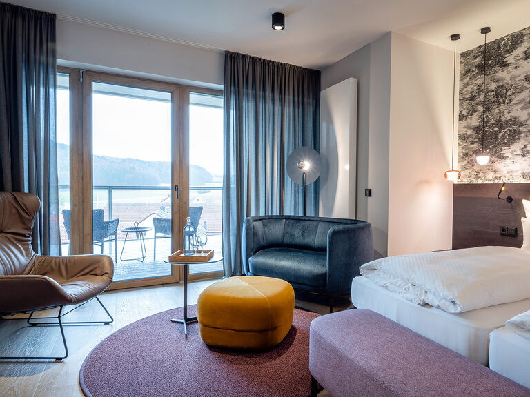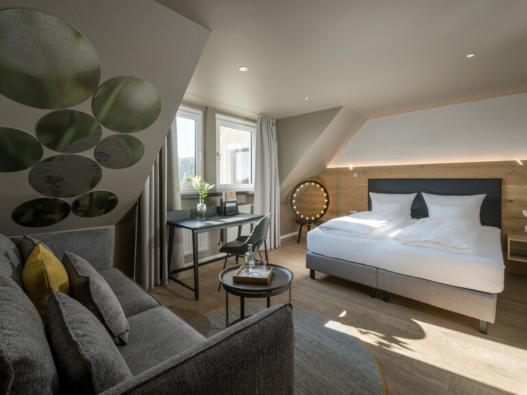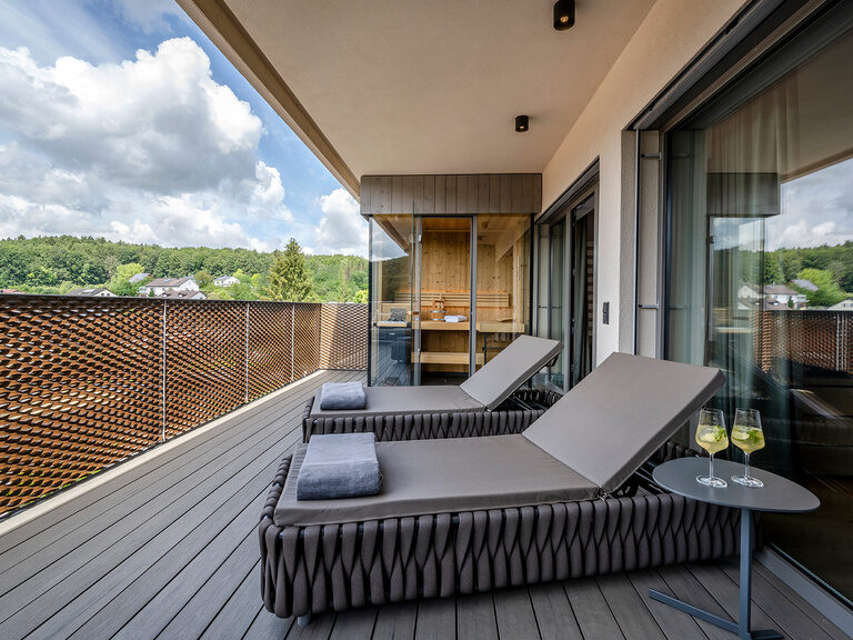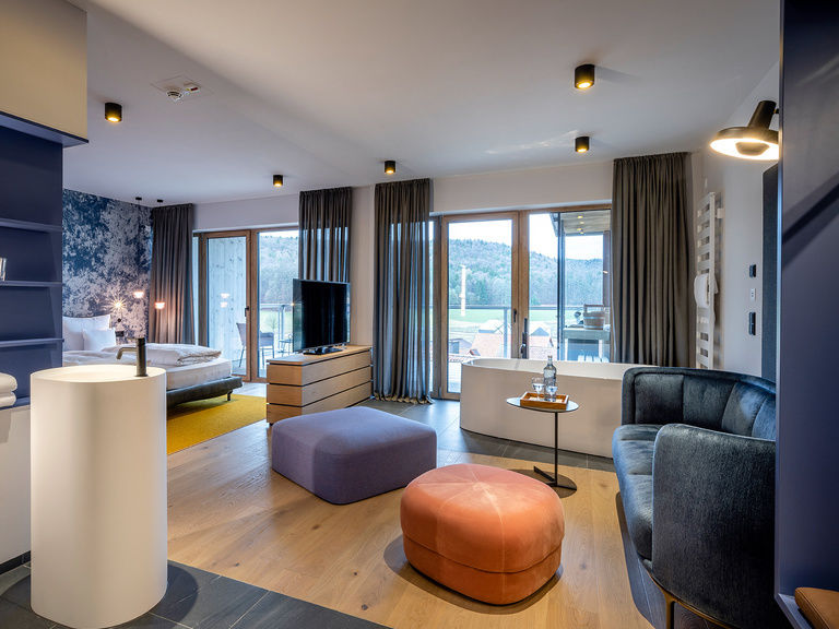 Hochwertige Möbel und Leuchten, himmlisch-bequeme Betten der Manufaktur Schramm (Bettengröße 100x210), freistehende Whirlpool-Wanne im Zimmer, kuschelige Wohnecke, Dachterrasse mit privater finnischer Sauna, aus der Sie den Blick über die umliegenden Wiesen und Wälder schweifen lassen können.